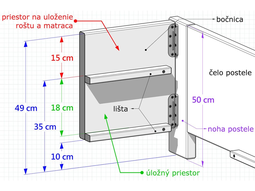 Pod lôžkom sa ukrýva praktický úložný priestor s dnom z 1 cm hrubej MDF dosky, umiestnený 10 cm nad podlahou.