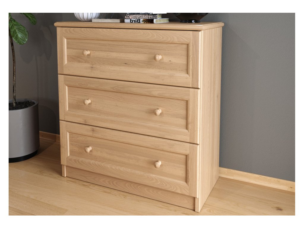Komoda Daniela je vyrobená z masívneho bukového dreva, ktoré zaručuje pevnosť a dlhú životnosť. Povrch je ošetrený ekologickým vodou riediteľným lakom, pričom je možnosť aj farebného morenia podľa vzorkovníka, aby komoda dokonale ladila s vaším interiérom.