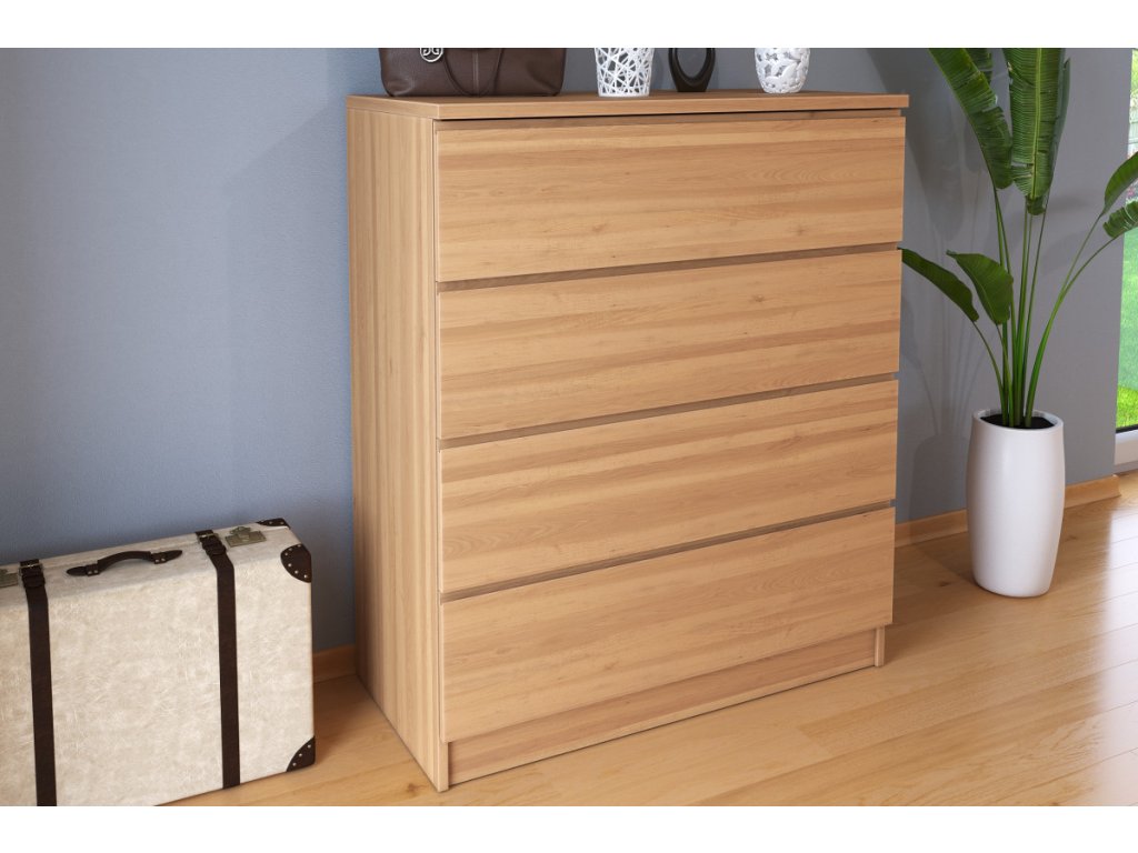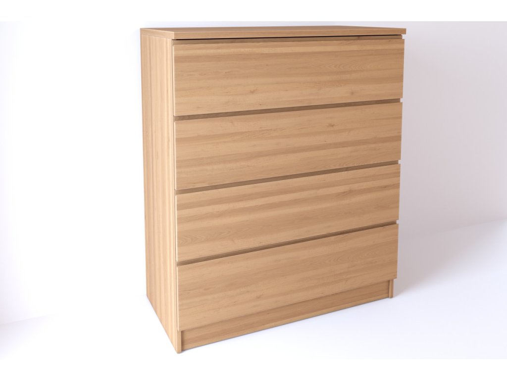 Úchyty na šuplíkoch sú vyfrézované pre elegantný a moderný vzhľad. Komoda je vybavená šuplíkmi s plnovýsuvom s tichým doťahom, ktoré umožňujú pohodlné a tiché používanie. Nosnosť každého šuplíka je až 30 kg, vhodná aj na ťažšie predmety.