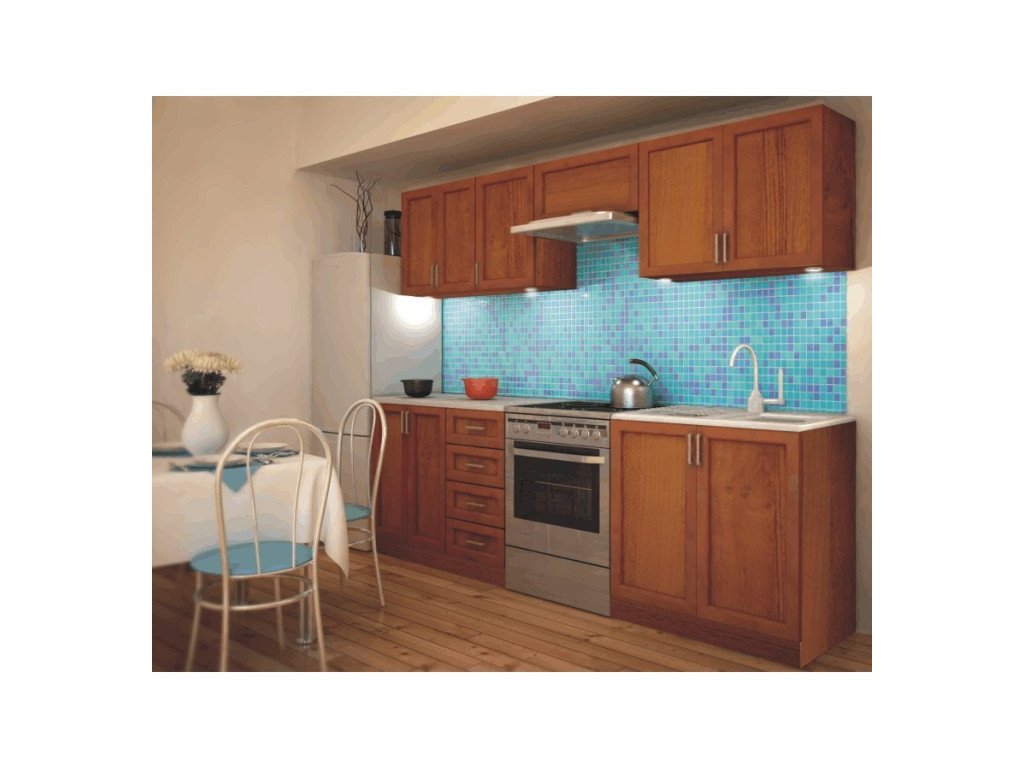 Základná zostava, v prevedení dvierka orech / korpus orech, DTD laminovaná, hrúbka pracovnej dosky 28 mm, horný rozmer s digestorou skrinkou 2,4 m, spodný rozmer 1,8 m, skrinky sú dodávané vrátane pracovnej dosky, drezová skrinka dodávaná bez pracovnej dosky.