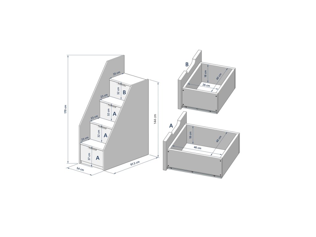 Na rozdiel od tradičných poschodových postelí ponúka Junior 4 široké schodíky namiesto klasického rebríka. Schodíky sú bezpečnejšie a pohodlnejšie pre deti a každý z nich zároveň slúži ako úložný priestor – ideálne miesto na hračky, oblečenie či posteľnú bielizeň.