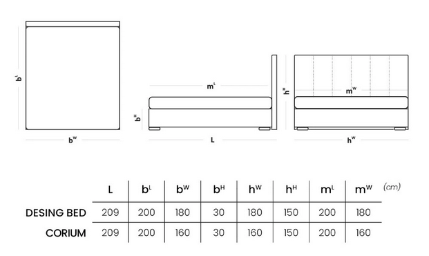 Rozmery postele pre variantu Boxspring (K ostatným typom boxov je potrebné pripočítať šírku bočnice 3, 5 alebo 8 cm)