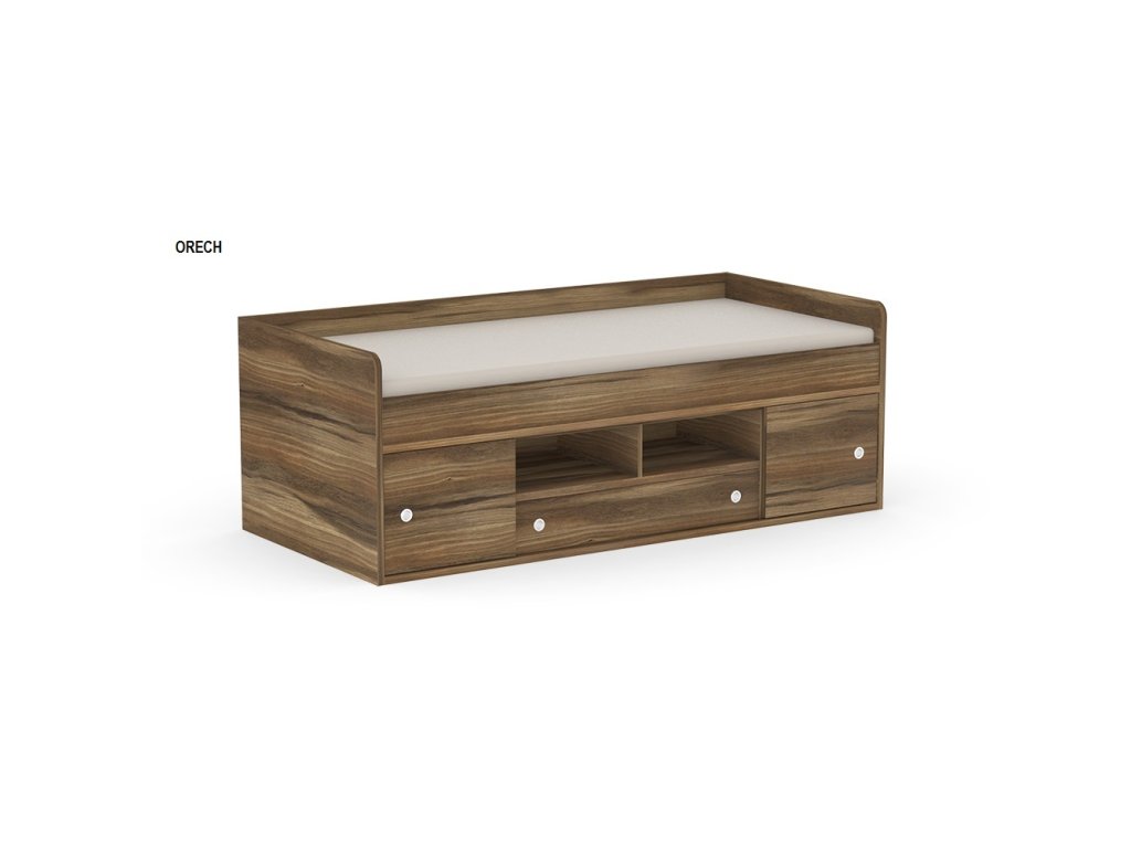 Kvalitné prevedenie dopĺňajú nízke postranné čelá tesne nad úrovňou lôžka so zaoblenými hranami, ktoré zvyšujú bezpečnosť pri používaní. Úložný priestor sa nachádza priamo pod lôžkom a tvorí ho zásuvka a sústava políc. Centrálne uložené police sú otvorené, kým bočné sú vybavené praktickými posuvnými čielkami, za ktoré jednoducho schováte všetko, čo nemá byť na očiach.